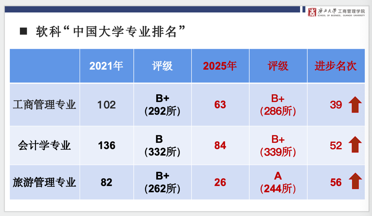 三个专业表现突出,排名实现跨越式提升。其中,工商管理专业由2021年全国第102名跃至第63名,评级保持B+;会计学专业从全国第136名攀升至第84名,评级由B提升至B+;旅游管理专业亦实现跨越式提升,从全国第82名大幅跃进至第26名,评级从B+跃升至A。