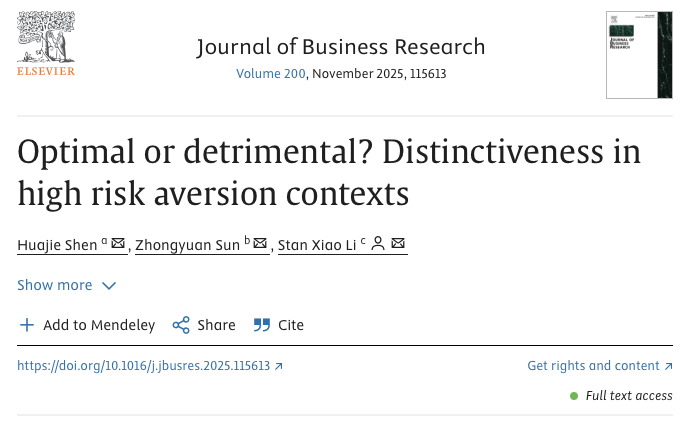 助理教授沈华杰与香港城市大学Stan Xiao Li教授、Zhongyuan Sun博士生在最优区分战略领域研究取得新进展,研究成果《Optimal or detrimental? Distinctiveness in high risk aversion contexts》在管理学高水平期刊《Journal of Business Research》网络首发。线上娱乐平台
