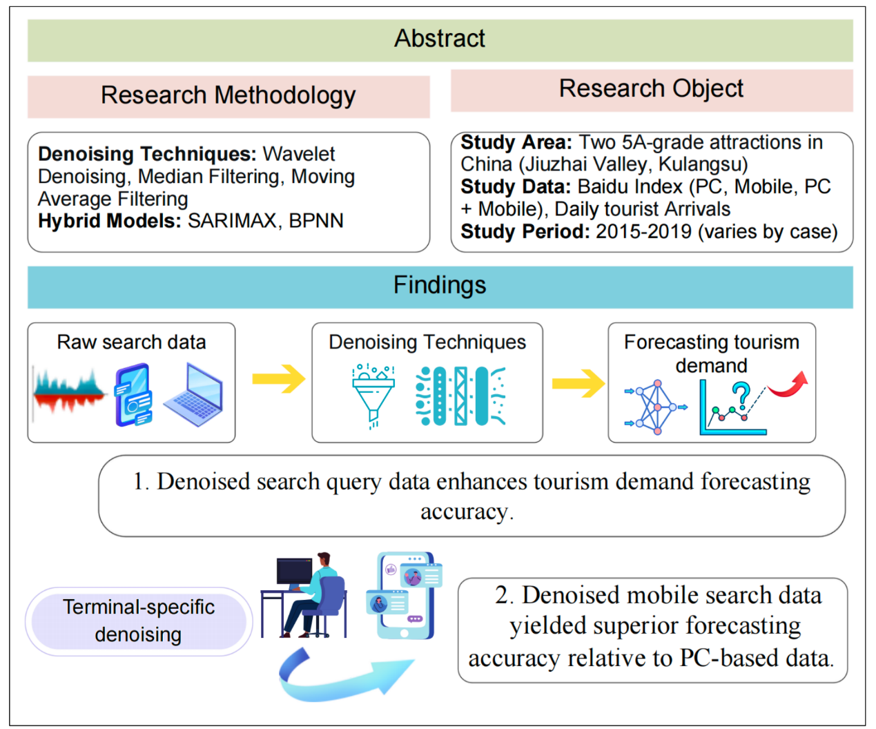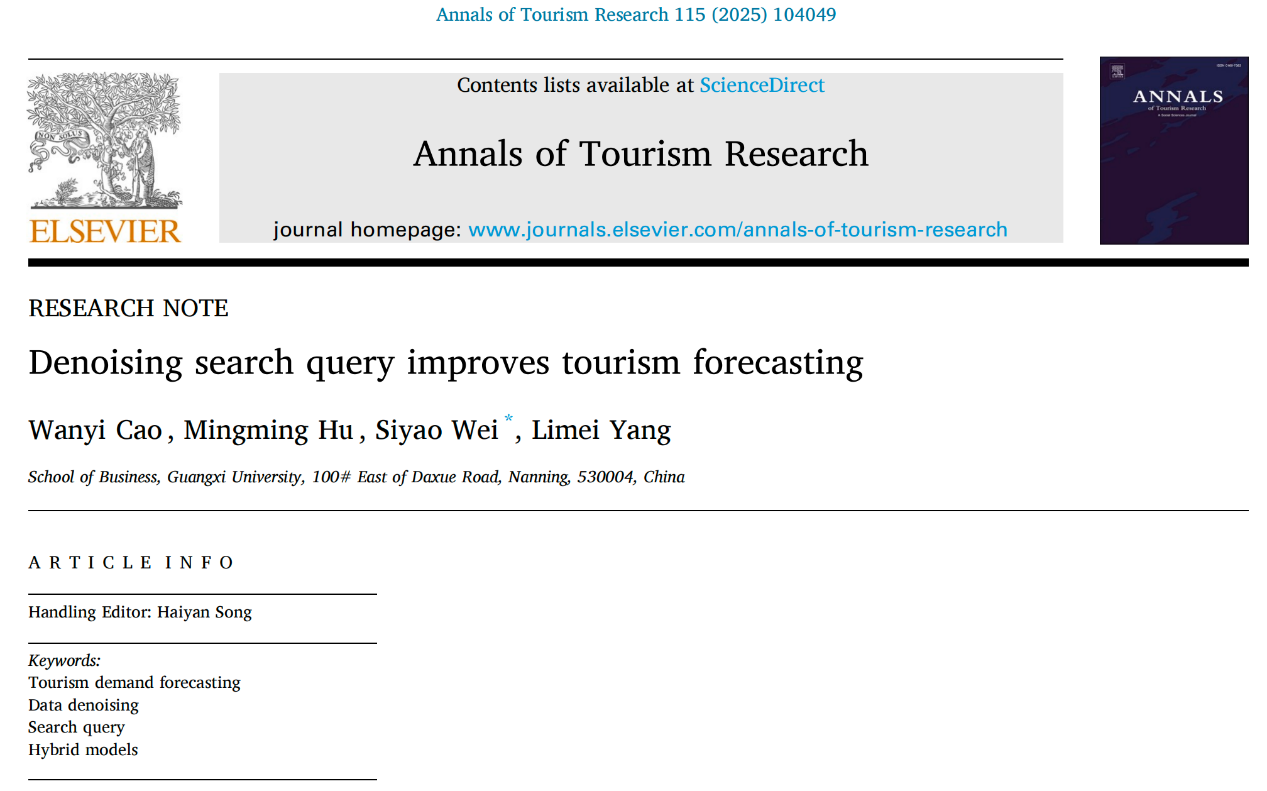 近日,线上娱乐平台 旅游管理系胡明明副教授科研团队在旅游需求预测领域研究取得重要进展,相关研究成果以“Denoising search query improves tourism forecasting”为题,在旅游管理领域国际三大顶级期刊之一《Annals of Tourism Research》在线发表。论文第一作者为线上娱乐平台 硕士研究生曹婉怡,通讯作者为硕士研究生韦思遥,第二作者为指导教师胡明明副教授,线上娱乐平台-新葡京线上娱乐 为第一单位和通讯单位。