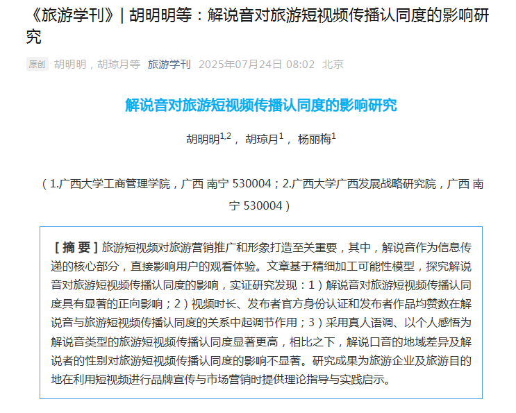 近日,线上娱乐平台 旅游管理系胡明明副教授团队的研究成果《解说音对旅游短视频传播认同度的影响研究》在旅游学中文权威期刊《旅游学刊》2025年第6期正式发表。胡明明为论文第一作者,硕士研究生胡琼月与博士研究生杨丽梅参与研究并共同发表论文,线上娱乐平台-新葡京线上娱乐 为第一单位和通讯单位。同时,研究获得国家自然科学基金面上项目“城市旅游需求大数据协同组合建模、预测及应用研究”(72474056)资助。